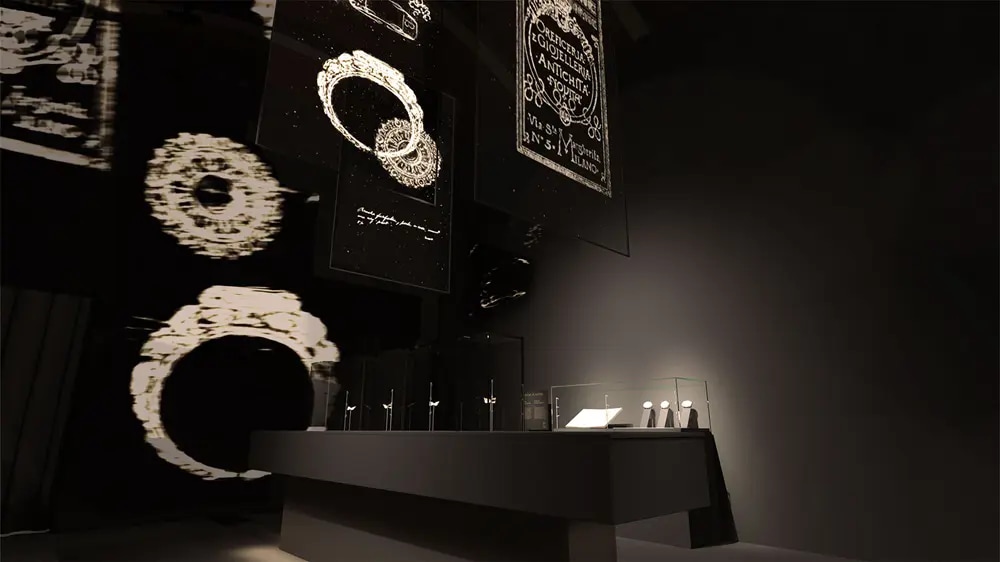 Visitors then enter the Natural Wonders section, an immersive room that celebrates nature as Buccellati’s eternal muse and inexhaustible source of inspiration. Projected arches, inspired by Renaissance botanicals, frame silver flowers and leaves from the Nature collection, suspended against a constantly moving video backdrop. On either side, tableaux vivants display decorative objects inspired by the natural world, including the famous Furry Animals, while Murano glass vases, the result of a collaboration with Venini, stand out in the side niches.