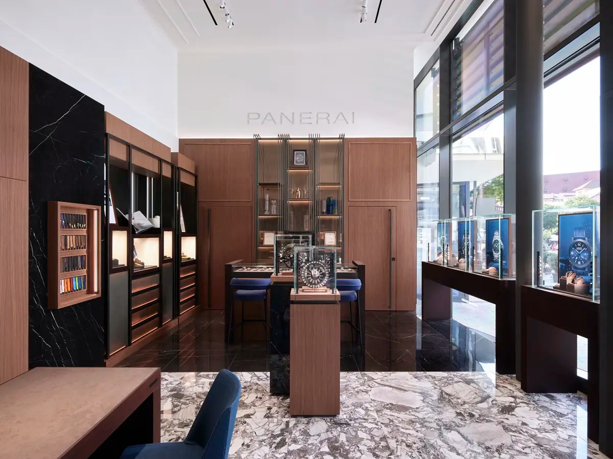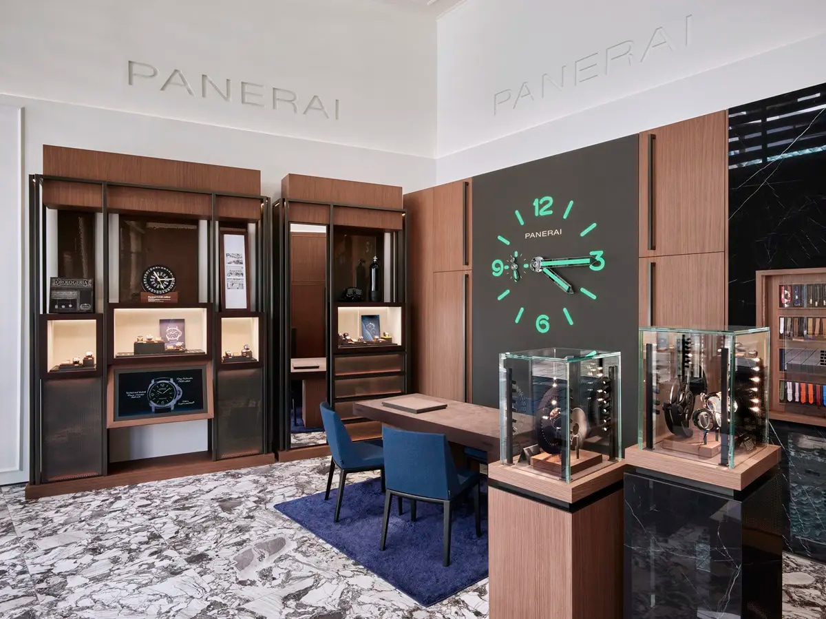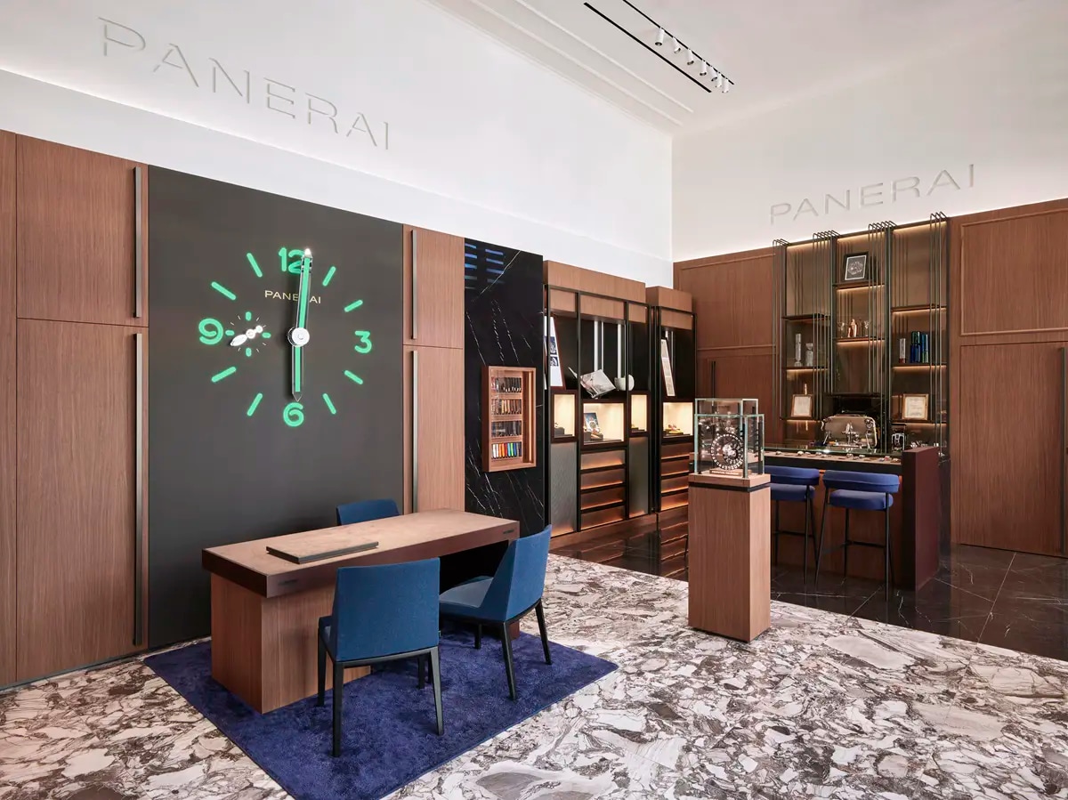 Covering 49 square metres, the boutique follows a layout that favours clarity and movement. At the entrance, a dedicated Watch Bar embodies Panerai’s contemporary interpretation of Italian hospitality, offering clients a relaxed and personal welcome into the brand universe. The presence of this informal space supports a more intuitive and experiential approach to the retail journey.