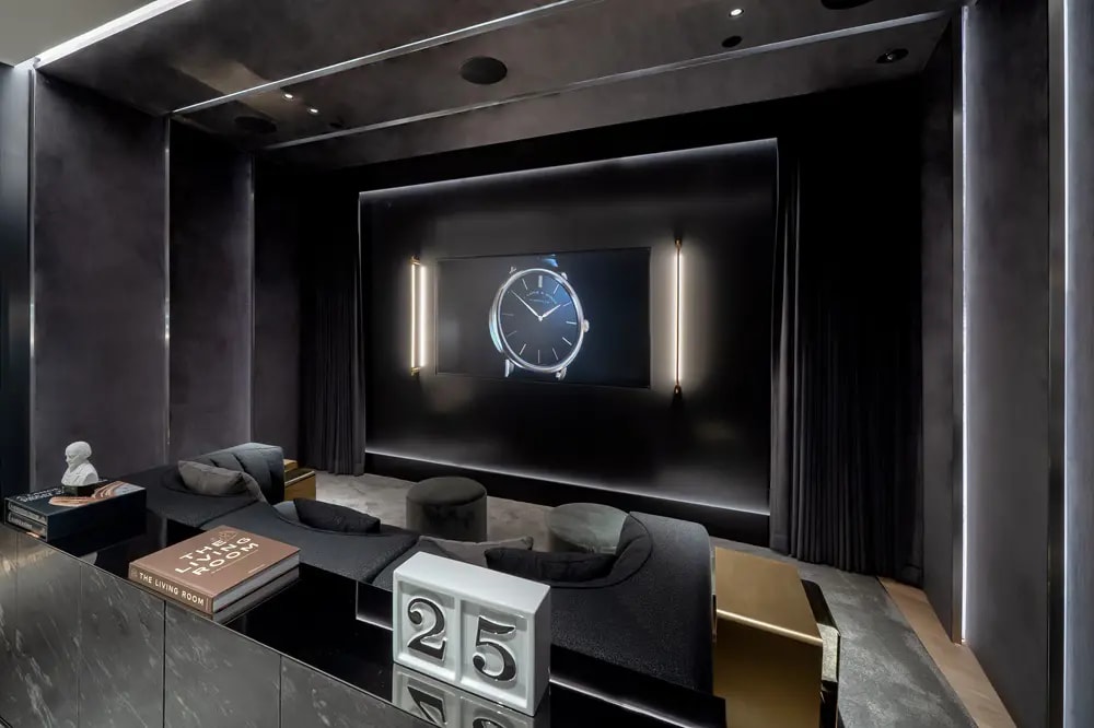 A sweeping staircase leads to the upper floor, where the boutique transitions into a luxurious private area. This space comprises two sales salons, a lounge, a presentation and theatre section, as well as an exclusive watchmaking experience corner. Surrounded by elegant bookcases, objets d’art, and rare timepieces, the upper level is designed to inspire conversation and discovery.