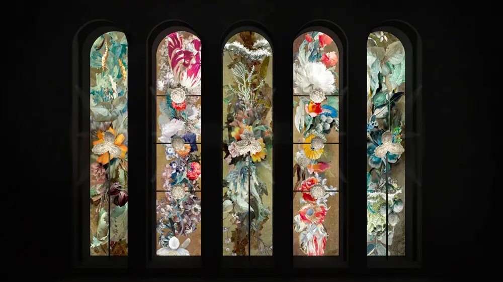 Visitors then enter the Natural Wonders section, an immersive room that celebrates nature as Buccellati’s eternal muse and inexhaustible source of inspiration. Projected arches, inspired by Renaissance botanicals, frame silver flowers and leaves from the Nature collection, suspended against a constantly moving video backdrop. On either side, tableaux vivants display decorative objects inspired by the natural world, including the famous Furry Animals, while Murano glass vases, the result of a collaboration with Venini, stand out in the side niches.